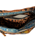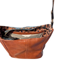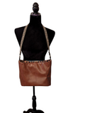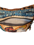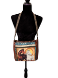 Western Theme Shoulder Bag was created with chestnut brown faux leather feature horses panel is quilt cotton and lining is arrowhead print cotton, and the strap is a jacquard 1" webbing. Features front deep zippered pocket, interior has another zippered pocket and a slip pocket. Measuress 11 inches wide by 11 inches high by 5 inches deep.