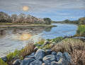 This oil painting depicts one of Calgary's picturesque parks with a river and trees in the evening sunset. The painting is for lovers of calm picturesque landscapes.