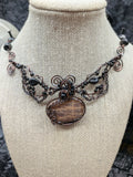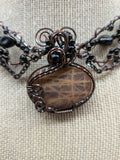 This Stunning Black Moonstone collar pendant is one that you can't take your eyes off as you gaze at all the beautiful flashes and elegant array accents and colours. It is wrapped in solid copper silver wire that has been antiqued and sealed to preserve its elegance. I strive to maintain a back view as exquisite as the front, allowing you to personally connect with your gemstone.