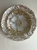 Katherine has a royal quality about her - made with layers of silver and gold and accented with a pearly white flower at her center. She's ornate, but only in a sophisticated way, making her a perfect touch for your refined space. Katherine measures 12" across.